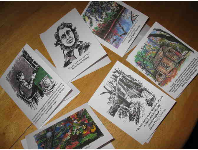 One set of six 4-1/4' x 5-1/2" blank greeting cards with envelopes. Each one carries a colorful freehand illustration inspired by a quote by Henry David Thoreau. The quotes are: "I went to the woods ..."; "Go confidently in the direction ..."; "Heaven is under our feet ..."; "Rather than love, than money ..."; "In Wildness is the preservation ..."; and "All good things are wild and free." Artist and donor Marianne Orlando learned to swim in Walden Pond.