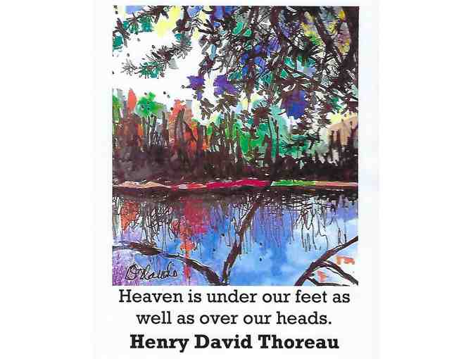 Cotton Women's T-shirt in white that rocks Henry Thoreau's Walden quote, "Heaven is under our feet as well as over our heads." Has a slightly scooped neck and comes in size Large. With artwork by Marianne Orlando, who learned to swim at Walden Pond.