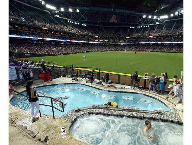 Four tickets to the Diamondbacks vs. Dodgers on Saturday, August 1st at 5:10 p.m. Great family seats in the outfield row directly next to the pool! Section 102, Row 14, Seats 1-4. Includes a $50 gift certificate to any Fox Restaurant Concepts location (suggested use is Arrogant Butcher by the ballpark but can be redeemed at any of their locations).