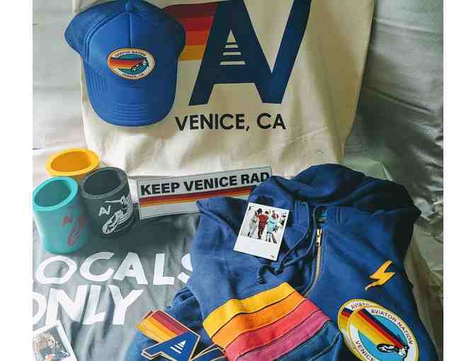 Rock out in style with this fresh AV Tote filled with a zip hoodie (adult L), Locals Only T (adult M), hat, coozies, and stickers. Keep Venice Rad!
