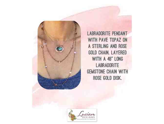 From Luciam Designs, Labradorite Pendant with pave topaz on a sterling and rose gold chain. Layered with a 48" long labradorite gemstone chain with rose gold disk.
