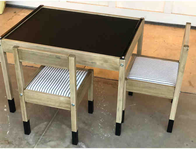 From The Jones Yard, custom kids art table with chalkboard top, two upholstered chairs and roll of paper attached.