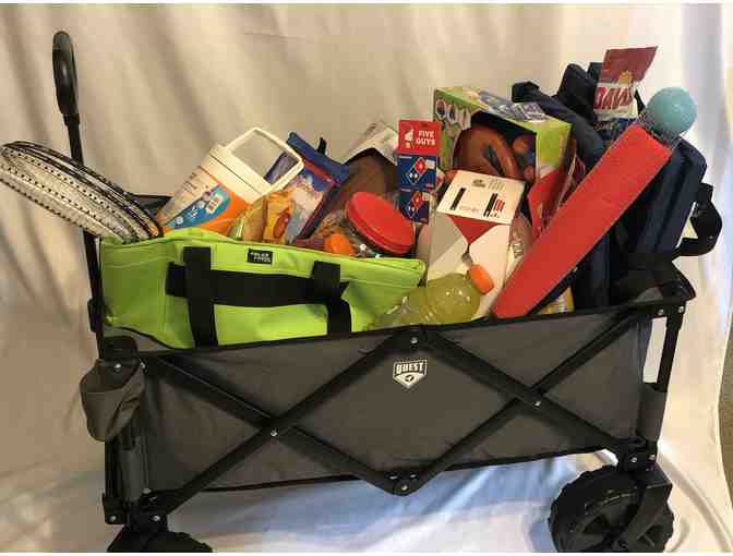 Quest Canvas Grey Wagon filled with everything sports. 2 deluxe Stadium Seats with back, Coleman water jug, football, baseball, kickball, badmitton set, deluxe kites. Other items include peanuts, pretzels, sunflower seeds, gatorade and beef jerky. Included in wagon are family bowling passes for 6 including shoes from Splitz Alley, 5 Guys Burger Gift Certificate and Ice Cream Gift Certificates. This basket will bring ease to your family sporting events!