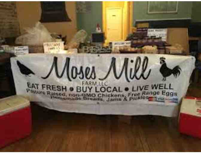 This $50 gift certificate is good for any Moses Mill Farm product -- from pasture-raised beef, chicken, or turkey, fresh eggs, vegetables, beeswax candles and body products including sugar scrubs, body butter, bath salts, lip balm. Everything is raised with care on green pasture, premium feed, fresh air and sunshine, right here in Chatham. It doesn't get more local and wholesome than that!