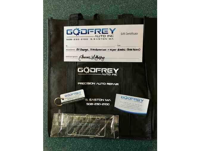 Gift certificate for an oil change, tire rotation, and wiper blades from Godfrey Auto Services. Shuttle service within a 10-mile radius, free rentals for costly repairs, 30-point courtesy check.