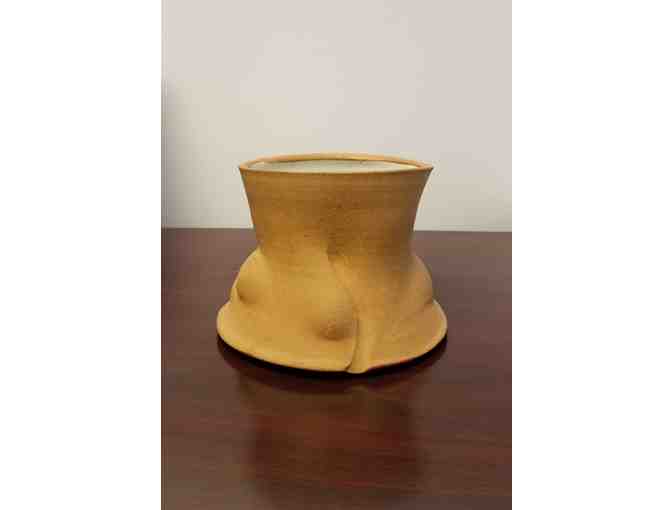 Handcrafted tan/brown ceramic pot, approximately 5" tall, oval shaped.