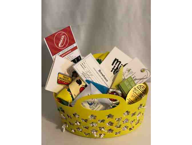 Enjoy several items from the Frazier Avenue area. $20 gift card Blue Sky, $10 gift card to Milk and Honey, $20 gift Card Olive Chattanooga, $25 Gift Certificate to Good Dog, $25 Gift Card to Taco Mamacitos plus t-shirt, $25 Brewhaus Gift Card, In-Town Art Decoration
