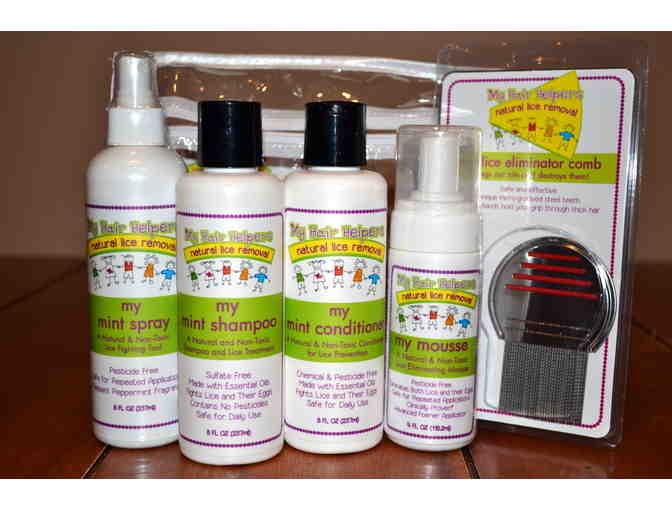 My Hair Helpers products are natural and non-toxic, using a lice removal process that works quickly and uses no harsh chemicals. This is an all-natural head lice removal kit includes a lice eliminator comb, mint spray, removal mousse, mint shampoo and mint conditioner. Instructions are included.