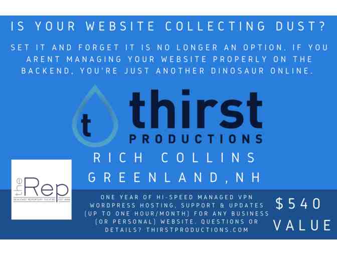 This is for one year of managed hosting and support for any Wordpress-based website on High-speed, professional grade VPN by Rich Collins of Thirst Productions, LLC – local to Greenland, NH and a longtime Seacoast resident.
