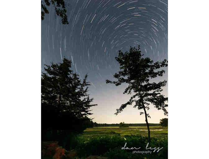 "Leach Pond Star Trails" Photo of stars in the night sky at Leach Pond, Borderland State Park. 7.5"x9.5" photo in an 11.5"x14.5" black frame with matting, taken by Easton resident Dan Less.