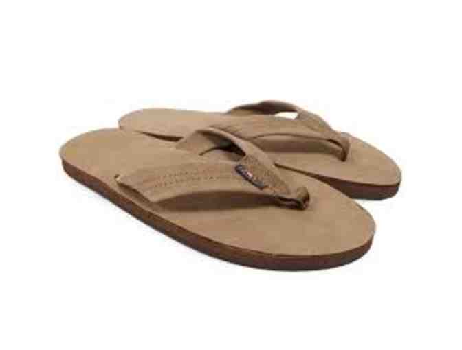 The single layer premier leather sandal is made with top grade nubuck leather; the top sole is embossed with the Rainbow logo. The strap, also nubuck leather; is double stitched, and the nylon toe piece is secured with a box X stitch, all using bonded nylon thread.
