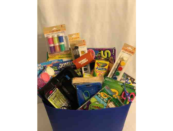 Blue Tub waiting for imagination and creativity. This tub is filled with a $15 Hobby Lobby Gift Card, Deluxe Wood Burning Kit, Dinasaur Craft Kit, Ultimate Slimy Gloop Kit, 50 deluxe Crayloa Markers, 4 Coloring Books, Construction Paper, Scissors, Poster Paint, 8 PKG Playdoh, 3-D Puzzle Kngaroo Book, Glow-N-Dark Power Balls, Crayola Create Your Own, Watercolor Paint, Paint Brushes, Art Foam Roller, 24 Crayons, Crayola Travel Pack.