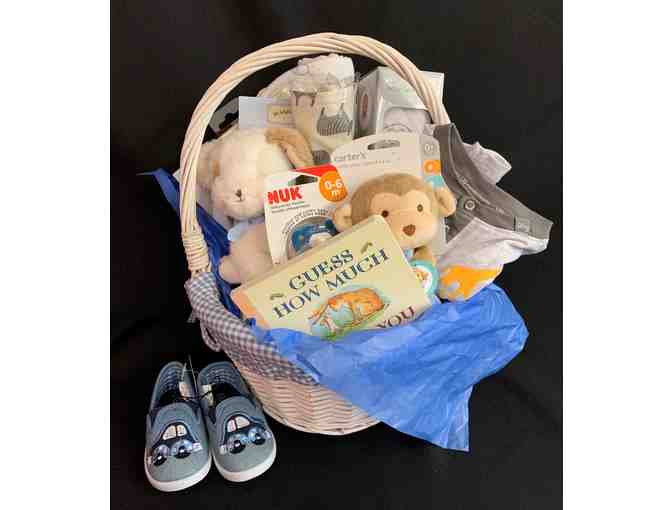 Basket, Hard Back Book Guess How Much I Love You, Nuk Pacifier 0-6 months, Baby's First Year - Tie Stickers, Skipit - Stuffed Animal, Cuddle Plush Monkey, Grey Hedgehog Swaddle Blanket, Blue Boat Swaddle Blanket, Bib (sheep), Shoes, and Giraffe Shirt