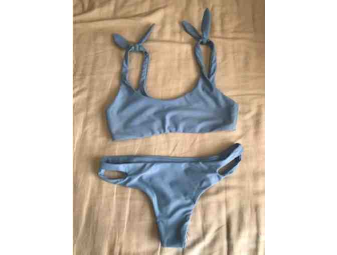 This 2 piece set (size S) includes the La Lancha Top in color sky blue and Sayulita Bottom in color sky blue.