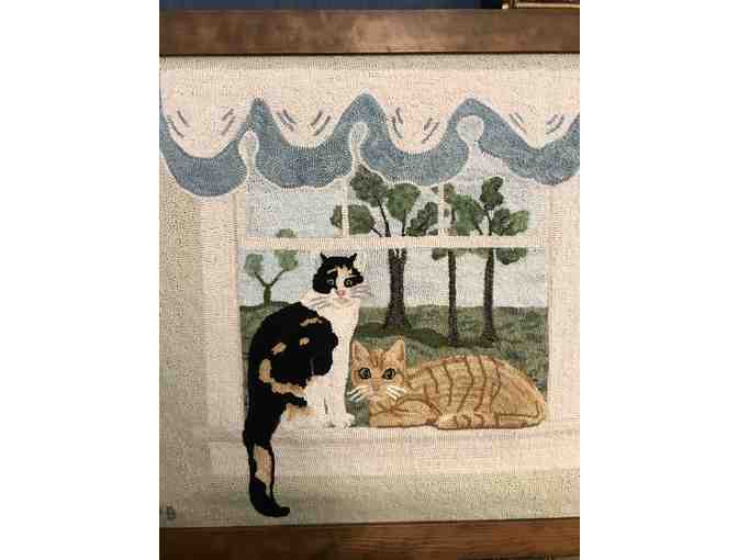 Homemade wool hooked rug with 2 cats sitting in a window. Measures 34" x 32"