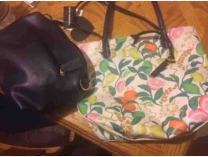 IMO Shoulder Bag in Bag Reversible Fruit Pattern/Black with removable strap. Outside (reversible) bag is 14" x 11 1/2" x 3 1/2". Inside black bag is 11" x 8" x 5".