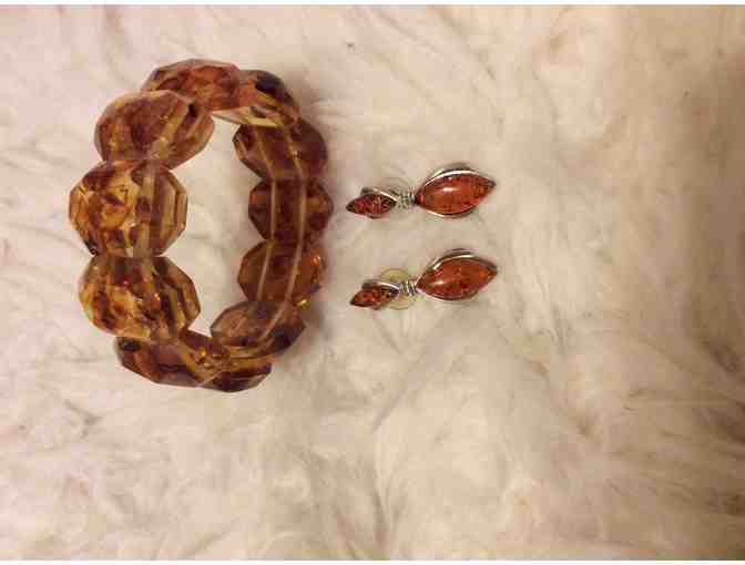 Luminous amber drop earrings set in sterling silver and expandable amber bracelet.