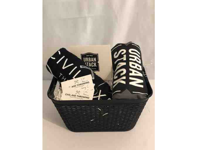 Enjoy a 1 hour Axe Throwing Session at Civil Axe and Dinner or Lunch at Urban Stack with a $25 Gift Card. Guaranteeed to help with stress for anyone!
