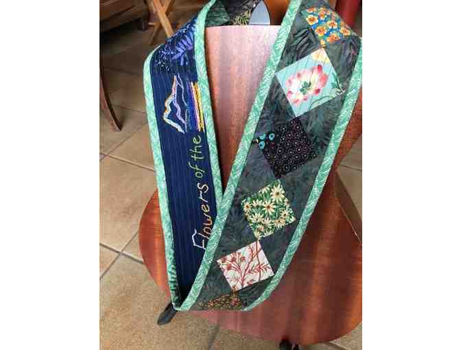 This strap will echo the beauty of camp songs even when you are not singing! I pieced together fabrics that evoke flowers of the woods, mountains, and islands. Embroidery on the underside says "...and on it I will place all the flowers of the Mountain."