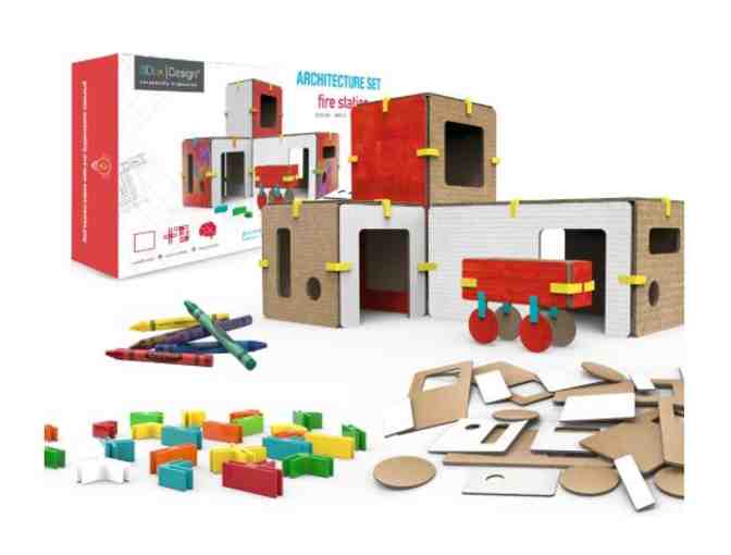 The Fire Station Architecture Kit is the perfect set for small kids with big imaginations. Build it, paint it, populate it, and play with it.This kit includes all cardboard pieces, connectors and crayons necessary to create the proposed architectural design along with extra components for vehicles, firefighters and your own firehouse design. Once you make your fire station, use the pieces to create anything else you can imagine.The connectors are engineered to fit most single-ply cardboard so your young designer will never run out of material or shapes to build with and will learn about creative repurposing of shipping boxes.