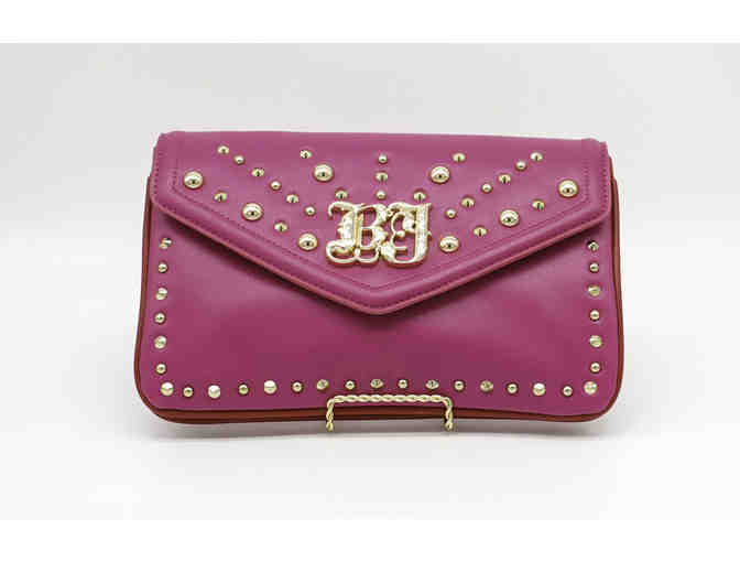 A girl loves her accessories and this handbag is one for the runway!  This hot pink Betsey Johnson® Va Va studs handbag flaunts beautiful gold studs through the front of the purse, a smooth faux-leather construction and gold brand logo hardware for added shine to your look!