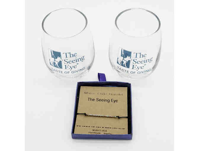 Love Seeing Eye Bling? How about toasting with two beautiful stemless wine glasses at your next event? Each wine glass boasts the Seeing Eye® Logo along with the saying “Taste of Giving”. Also includes a stunning handmade Morse Code Bracelet that reads “The Seeing Eye”. Made from sterling silver beads with a wax leather cord this is truly a unique piece! Fully adjustable and can be worn as an anklet too.