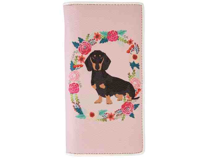 This faux-leather wallet features a teal facade and plenty of pockets to keep your essentials organized. There's no question, your favorite breed is just your style! Surrounded by bright blooms! Vinyl Zippered compartment: 2 bill slots Magnetic snap compartment: 3 bill slots, 11 card slots, 1 ID slot 7.5" L x 4" W x 1" D (19 x 10 x 2.5 cm)