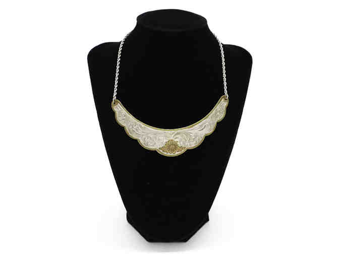 Enjoy country glamour with this vintage sterling silver-and gold-plated choker necklace from Montana Silversmiths. The beautiful 4” hard plated metal design in silver and gold is fastened to a 5" chain on each side with a clasp in back.