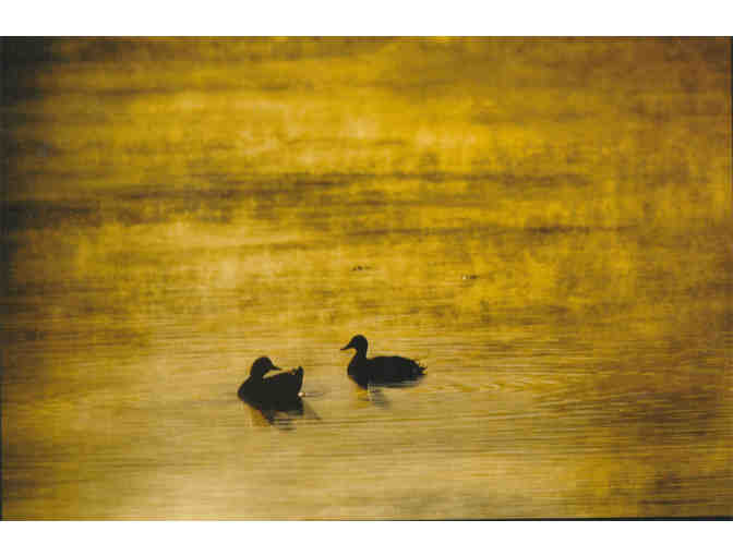 "Mallards in the Mist" is a photograph of a pair of mallards, from The Walden Pond Collection of National Geographic photographer Tim Laman. A dye-sublimation process is used to infuse the photograph onto recycled aluminum. The 12 x 8 inch aluminum is fused to ¼” black sintra and mounted to an aluminum float backing which has a lip for easy wall hanging. Tim Laman's signature appears on the label on the back. Perhaps you've seen this image with others in the series, hanging on the wall in the Shop at Walden Pond. A stunning and colorful photograph taken right at Walden Pond in Concord, Massachusetts.
