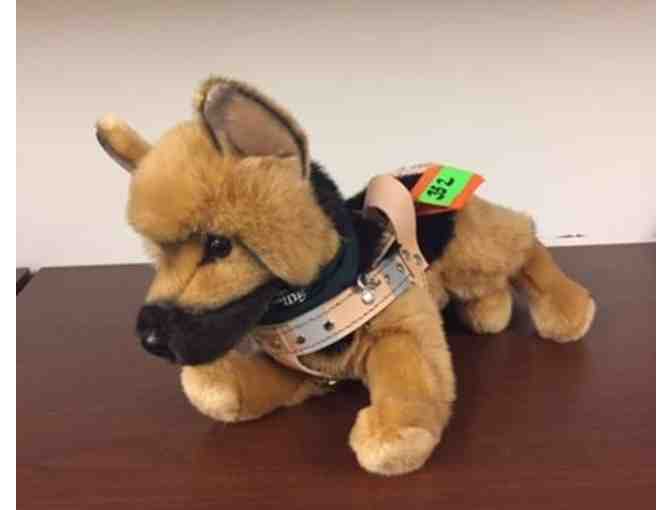 Meet "Sarge," our delightfully plush toy German shepherd puppy. This stuffed animal is standing, looking for a friend to keep him company. His attractive tan coat with black markings is accented by a beautiful, handmade leather toy harness. Sarge will surely take charge of any heart that hugs him. Why not make it yours?