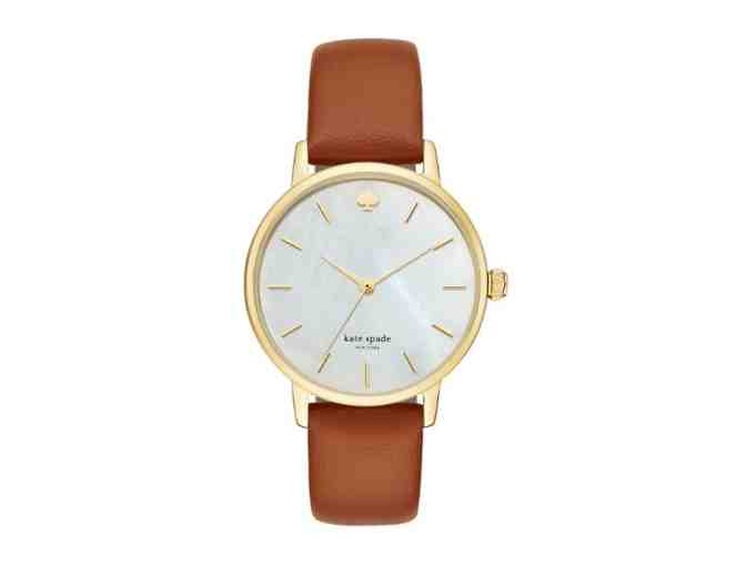 Color: Gold-plated stainless steel case with adjustable luggage brown leather strap. Traditional buckle closure. Three-hand analog display with quartz movement. White mother-of-pearl dial face features cursive hour markers and brand name.