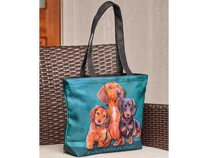 Who can resist these smiling Dachshunds on this sturdy tote bag? Tote is: 13-3/4"W x 3-3/4"D x 10"H, with a 10" handle drop Material - Polyester Zippered top closure. NWT