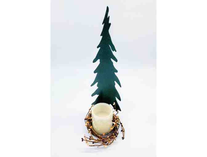 A wrought iron pine tree towers above a wreath and flameless white pillar candle. The tree is painted green, and the wreath that surrounds the candle is a twig wreath with buds on it. The trees is about eighteen inches tall, and the stand is about 5 inches deep and 9 inches wide. This is a unique piece which can add light and intimacy to your home in a completely safe manner. Light up your life!