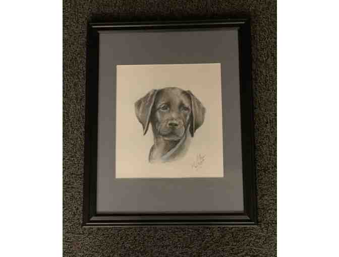 What a handsome boy! This graphite sketch shows Felix, a Black Labrador retriever training to be a Seeing Eye dog, when he was a puppy. His soulful eyes are looking to the right of the viewer and his ears hang down to his chin. He is wearing a thin blue collar that is way too big for him that makes him look all the more adorable. The 10” x 11” sketch is matted in dusty blue to fit in a 16” x 20” black frame. Artist Albina P. Herron has captured the true beauty of black lab puppies!