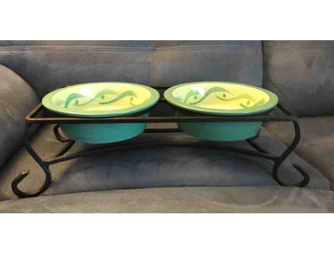 Southern Living at Home elevated ceramic food bowls with wrought iron stand.