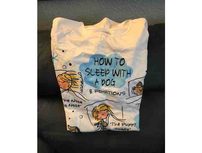 One size fits all, ladies "How to sleep with a dog' sleep shirt with bag.