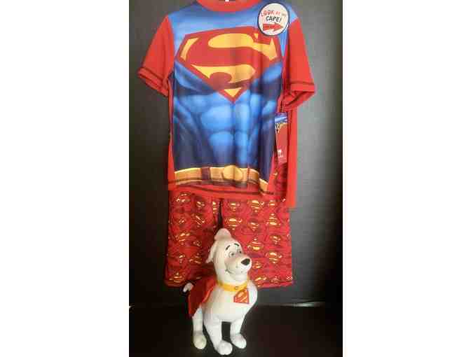 3-Piece Superman flame resistant Sleep Set; short-sleeved shirt, pants and removeable cape for your favorite superhero, Size XS (4/5), PLUS a Krypto stuffed animal!