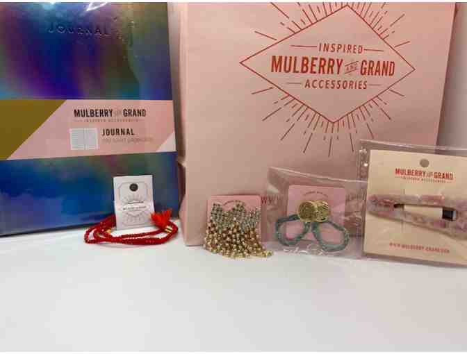 The ultimate accessory package from Mulberry and Grand: bracelets, two pairs of earrings, a hair clip, and a notebook.