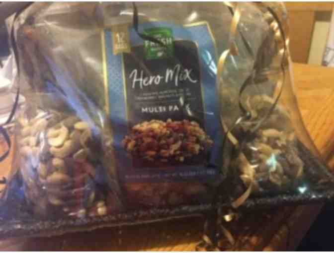 Basket just filled with nuts of ALL kinds!  Contains 6 containers of different kinds of mixed nuts, one container of sunflower seeds, one container of pepitas, and a Hero-Mix multi pack of 12 (1.5 oz) bags of cashews, almonds, dried cranberries, walnuts and pepitas.  If you like nuts, this is truly and incredible basket!