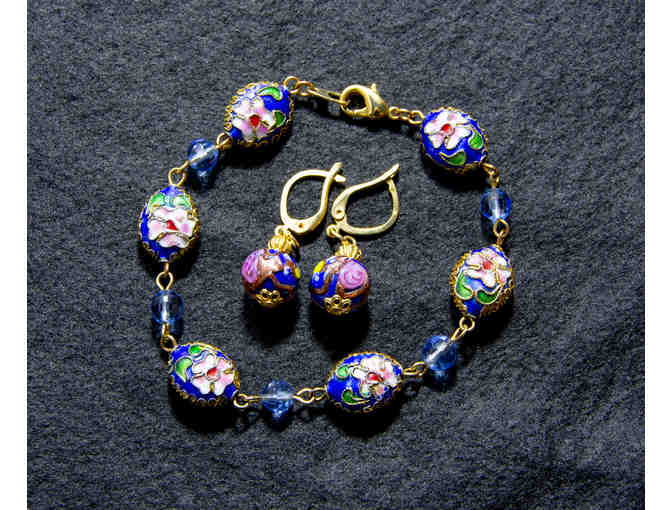 This is a lovely little set. The deep blue glass beads of the bracelet are adorned with lovely pink flowers and green leaves all outlined with tracing of gold glass. Each large bead has a gold detailed border around the rim of the bead. Hook back earrings to match complete the set. Excellent condition.