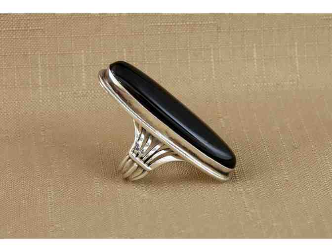 This ring is stunning in its size and simplicity.  The very long oval onyx cabochon is bevel set in sterling and rimmed with an small intricate rope pattern. The stone is excellent condition with no chips or scratched. What a statement piece!