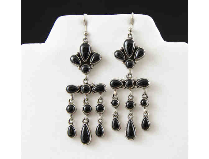 This handsome pair of chandelier style earrings crafted from sterling silver and onyx were made by Navajo jewelry artist Emma Lincoln. Onyx stones are tear drop and round shapes, the largest of which measures 1/2" long and the smallest 1/8". Back is marked sterling and bears the Emma Lincoln maker's mark.