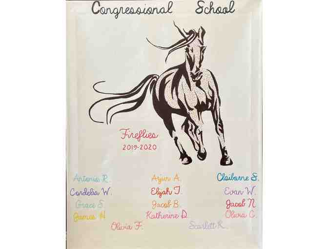 Our adorable Firefly Class has created a one-of-a-kind canvas painting of a colorful horse (or colt)! Each Firefly created 80 dots with a unique color of their choosing, to commemorate Congressional School's 80th year. Their names are written on the canvas in the color that they chose to dot paint with.