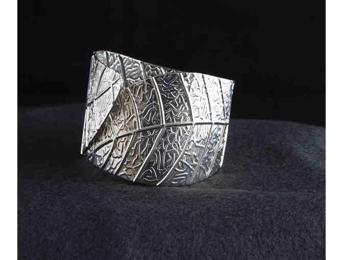 Very pretty silver tone metal cuff bracelet in a leaf motif. Hinged for easy on and off. Very good condition.