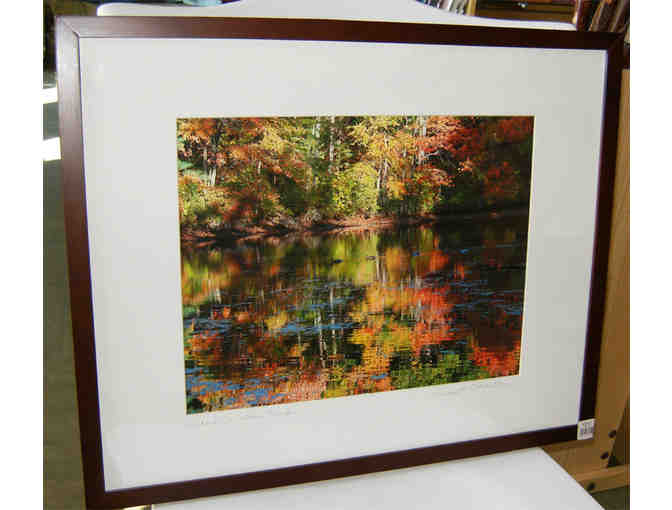A matted and framed photograph by local photographer Alice Wellington. Several ducks paddle through a perfect autumn mirror at Walden Pond. Finished in a bold brown frame and under glass. Measures about 17 x 21 inches with the frame.