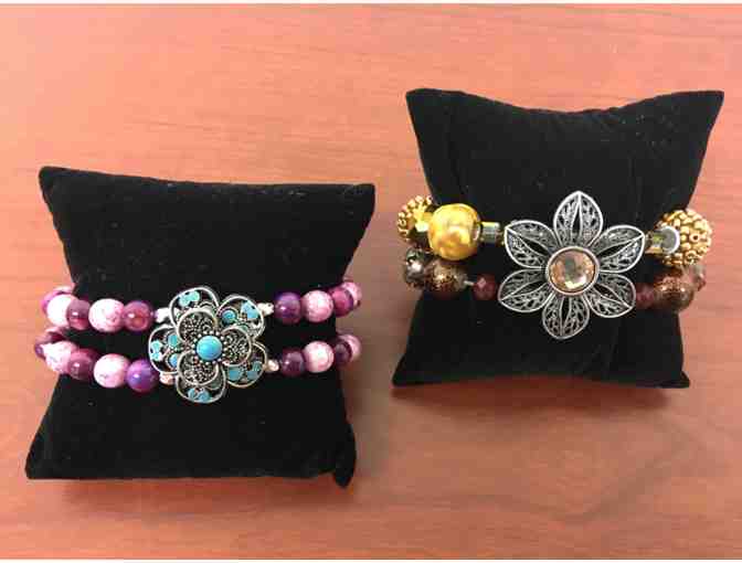 April showers bring May flowers! Show off these lovely flowered bracelets made by Beads Fur Rescue when shopping around town. Bracelet #1 has a silver flower studded with blue accent stones on a double stranded stretch bracelet of same sized variegated purple stones. Bracelet #2 is a delicate filigree silver flower with an amber faceted gem in the center. This double stranded stretch bracelet contains a variety of beads in different sizes and color: maroon, gold, black and smoke colored faceted beads, smooth gold beads, copper variegated beads, and gold floral beads. Bracelets fit size 7"-8" wrists and come in drawstring organza bags. And don’t forget “a dog can change the way you see the world” tote bag for shopping!