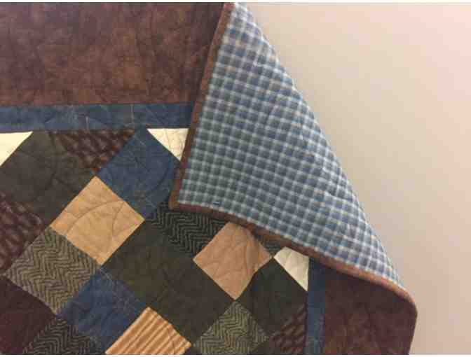 This cozy quilt stirs up memories of crackling fires, warm apple cider, and fall family gatherings. Its handsome checkerboard pattern will add rich tones of brown, forest green, deep blue and tan to any room. The blacking is a blue flannel plaid that will keep you warm on a cold winter night. So don't let this one get away!