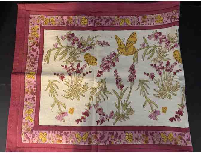 Provencal-inspired table linen with yellow butterflies and a pink border.