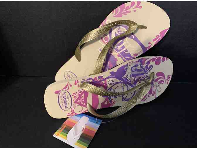 Enjoy a pair of Size 9 flip flops with a "Supergirl" design/logo.