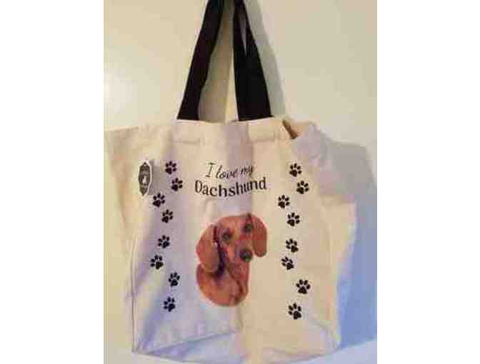 The reusable sturdy canvas shopping tote would look good on your shoulder as you do your shopping. The phrase, "I Love my Dachshund" is centered over a red short hair dachshund bust with dog paws framing it. It measures 15" x 15" with a width of 5", enough to hold a bunch of groceries. and has two handles.